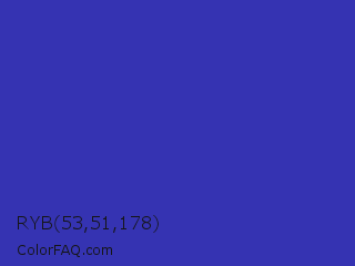 RYB 53,51,178 Color is a normal indigo color and the nearest color is Governor Bay #2f3cb3. Hex code #3533b2 and RGB value is rgb(53,51,178). In RGB color space, this color is composed of 21% red, 20% green, 70% blue, In CMYK color space, this color is composed of 70% cyan, 71% magenta, 0% yellow , 30% black , In HSL color space, this color has a hue angle of 241° , 55% saturation and 45% lightness.
