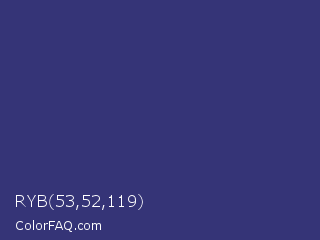 RYB 53,52,119 Color is a normal indigo color and the nearest color is Minsk #3f307f. Hex code #353477 and RGB value is rgb(53,52,119). In RGB color space, this color is composed of 21% red, 20% green, 47% blue, In CMYK color space, this color is composed of 55% cyan, 56% magenta, 0% yellow , 53% black , In HSL color space, this color has a hue angle of 241° , 39% saturation and 34% lightness.