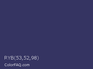 RYB 53,52,98 Color is a dark indigo color and the nearest color is Deep Koamaru #333366. Hex code #353462 and RGB value is rgb(53,52,98). In RGB color space, this color is composed of 21% red, 20% green, 38% blue, In CMYK color space, this color is composed of 46% cyan, 47% magenta, 0% yellow , 62% black , In HSL color space, this color has a hue angle of 241° , 31% saturation and 29% lightness.