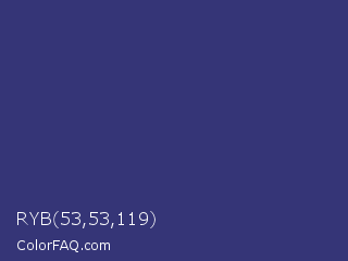 RYB 53,53,119 Color is a normal blue color and the nearest color is Minsk #3f307f. Hex code #353577 and RGB value is rgb(53,53,119). In RGB color space, this color is composed of 21% red, 21% green, 47% blue, In CMYK color space, this color is composed of 55% cyan, 55% magenta, 0% yellow , 53% black , In HSL color space, this color has a hue angle of 240° , 38% saturation and 34% lightness.