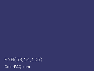 RYB 53,54,106 Color is a normal blue color and the nearest color is Deep Koamaru #333366. Hex code #35366a and RGB value is rgb(53,54,106). In RGB color space, this color is composed of 21% red, 21% green, 42% blue, In CMYK color space, this color is composed of 50% cyan, 49% magenta, 0% yellow , 58% black , In HSL color space, this color has a hue angle of 239° , 33% saturation and 31% lightness.