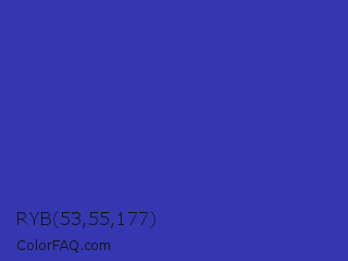 RYB 53,55,177 Color is a normal blue color and the nearest color is Governor Bay #2f3cb3. Hex code #3537b1 and RGB value is rgb(53,55,177). In RGB color space, this color is composed of 21% red, 22% green, 69% blue, In CMYK color space, this color is composed of 70% cyan, 69% magenta, 0% yellow , 31% black , In HSL color space, this color has a hue angle of 239° , 54% saturation and 45% lightness.