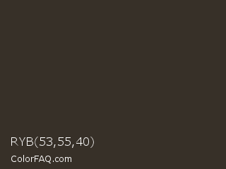 RYB 53,55,40 Color is a very dark orange color and the nearest color is Birch #373021. Hex code #373028 and RGB value is rgb(55,48,40). In RGB color space, this color is composed of 22% red, 19% green, 16% blue, In CMYK color space, this color is composed of 0% cyan, 13% magenta, 27% yellow , 78% black , In HSL color space, this color has a hue angle of 32° , 16% saturation and 19% lightness.
