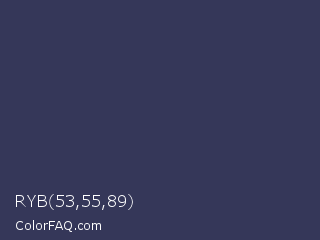 RYB 53,55,89 Color is a dark blue color and the nearest color is Martinique #363050. Hex code #353759 and RGB value is rgb(53,55,89). In RGB color space, this color is composed of 21% red, 22% green, 35% blue, In CMYK color space, this color is composed of 40% cyan, 38% magenta, 0% yellow , 65% black , In HSL color space, this color has a hue angle of 237° , 25% saturation and 28% lightness.