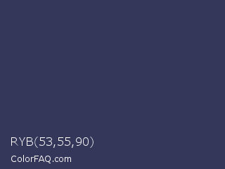 RYB 53,55,90 Color is a dark blue color and the nearest color is Martinique #363050. Hex code #35375a and RGB value is rgb(53,55,90). In RGB color space, this color is composed of 21% red, 22% green, 35% blue, In CMYK color space, this color is composed of 41% cyan, 39% magenta, 0% yellow , 65% black , In HSL color space, this color has a hue angle of 237° , 26% saturation and 28% lightness.