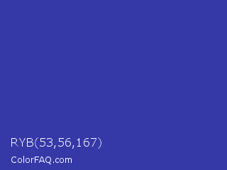 RYB 53,56,167 Color is a normal blue color and the nearest color is Governor Bay #2f3cb3. Hex code #3538a7 and RGB value is rgb(53,56,167). In RGB color space, this color is composed of 21% red, 22% green, 65% blue, In CMYK color space, this color is composed of 68% cyan, 66% magenta, 0% yellow , 35% black , In HSL color space, this color has a hue angle of 238° , 52% saturation and 43% lightness.