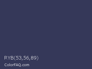 RYB 53,56,89 Color is a dark blue color and the nearest color is Martinique #363050. Hex code #353859 and RGB value is rgb(53,56,89). In RGB color space, this color is composed of 21% red, 22% green, 35% blue, In CMYK color space, this color is composed of 40% cyan, 37% magenta, 0% yellow , 65% black , In HSL color space, this color has a hue angle of 235° , 25% saturation and 28% lightness.
