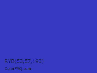 RYB 53,57,193 Color is a normal blue color and the nearest color is Governor Bay #2f3cb3. Hex code #3539c1 and RGB value is rgb(53,57,193). In RGB color space, this color is composed of 21% red, 22% green, 76% blue, In CMYK color space, this color is composed of 73% cyan, 70% magenta, 0% yellow , 24% black , In HSL color space, this color has a hue angle of 238° , 57% saturation and 48% lightness.