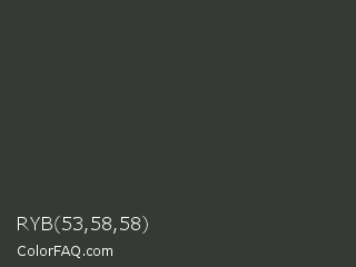 RYB 53,58,58 Color is a very dark green color and the nearest color is Onyx #353839. Hex code #353a35 and RGB value is rgb(53,58,53). In RGB color space, this color is composed of 21% red, 23% green, 21% blue, In CMYK color space, this color is composed of 9% cyan, 0% magenta, 9% yellow , 77% black , In HSL color space, this color has a hue angle of 120° , 5% saturation and 22% lightness.