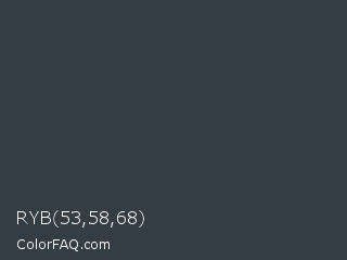RYB 53,58,68 Color is a dark blue color and the nearest color is Tuna #353542. Hex code #353d44 and RGB value is rgb(53,61,68). In RGB color space, this color is composed of 21% red, 24% green, 27% blue, In CMYK color space, this color is composed of 22% cyan, 10% magenta, 0% yellow , 73% black , In HSL color space, this color has a hue angle of 208° , 12% saturation and 24% lightness.