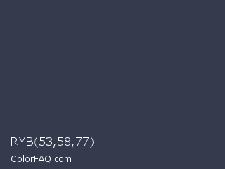 RYB 53,58,77 Color is a dark blue color and the nearest color is Bright Gray #3c4151. Hex code #353b4d and RGB value is rgb(53,59,77). In RGB color space, this color is composed of 21% red, 23% green, 30% blue, In CMYK color space, this color is composed of 31% cyan, 23% magenta, 0% yellow , 70% black , In HSL color space, this color has a hue angle of 225° , 18% saturation and 25% lightness.