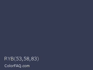 RYB 53,58,83 Color is a dark blue color and the nearest color is Bright Gray #3c4151. Hex code #353b53 and RGB value is rgb(53,59,83). In RGB color space, this color is composed of 21% red, 23% green, 33% blue, In CMYK color space, this color is composed of 36% cyan, 29% magenta, 0% yellow , 67% black , In HSL color space, this color has a hue angle of 228° , 22% saturation and 27% lightness.