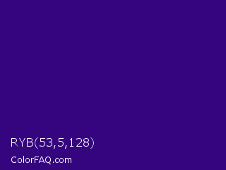 RYB 53,5,128 Color is a dark violet color and the nearest color is Kingfisher Daisy #3e0480. Hex code #350580 and RGB value is rgb(53,5,128). In RGB color space, this color is composed of 21% red, 2% green, 50% blue, In CMYK color space, this color is composed of 59% cyan, 96% magenta, 0% yellow , 50% black , In HSL color space, this color has a hue angle of 263° , 92% saturation and 26% lightness.