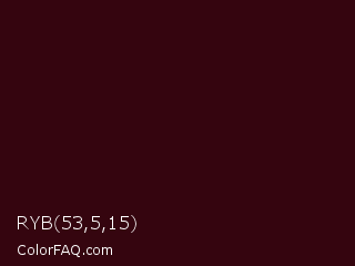 RYB 53,5,15 Color is a very dark red color and the nearest color is Aubergine #3b0910. Hex code #35050f and RGB value is rgb(53,5,15). In RGB color space, this color is composed of 21% red, 2% green, 6% blue, In CMYK color space, this color is composed of 0% cyan, 91% magenta, 72% yellow , 79% black , In HSL color space, this color has a hue angle of 348° , 83% saturation and 11% lightness.