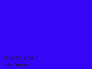 RYB 53,5,247 Color is a normal indigo color and the nearest color is Electric Ultramarine #3f00ff. Hex code #3505f7 and RGB value is rgb(53,5,247). In RGB color space, this color is composed of 21% red, 2% green, 97% blue, In CMYK color space, this color is composed of 79% cyan, 98% magenta, 0% yellow , 3% black , In HSL color space, this color has a hue angle of 252° , 96% saturation and 49% lightness.