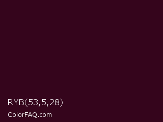 RYB 53,5,28 Color is a very dark rose color and the nearest color is Toledo #3a0020. Hex code #35051c and RGB value is rgb(53,5,28). In RGB color space, this color is composed of 21% red, 2% green, 11% blue, In CMYK color space, this color is composed of 0% cyan, 91% magenta, 47% yellow , 79% black , In HSL color space, this color has a hue angle of 331° , 83% saturation and 11% lightness.