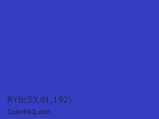 RYB 53,61,192 Color is a normal blue color and the nearest color is Governor Bay #2f3cb3. Hex code #353dc0 and RGB value is rgb(53,61,192). In RGB color space, this color is composed of 21% red, 24% green, 75% blue, In CMYK color space, this color is composed of 72% cyan, 68% magenta, 0% yellow , 25% black , In HSL color space, this color has a hue angle of 237° , 57% saturation and 48% lightness.