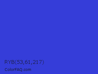 RYB 53,61,217 Color is a normal blue color and the nearest color is Palatinate Blue #273be2. Hex code #353dd9 and RGB value is rgb(53,61,217). In RGB color space, this color is composed of 21% red, 24% green, 85% blue, In CMYK color space, this color is composed of 76% cyan, 72% magenta, 0% yellow , 15% black , In HSL color space, this color has a hue angle of 237° , 68% saturation and 53% lightness.