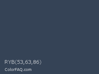 RYB 53,63,86 Color is a dark blue color and the nearest color is Oxford Blue #384555. Hex code #354356 and RGB value is rgb(53,67,86). In RGB color space, this color is composed of 21% red, 26% green, 34% blue, In CMYK color space, this color is composed of 38% cyan, 22% magenta, 0% yellow , 66% black , In HSL color space, this color has a hue angle of 215° , 24% saturation and 27% lightness.