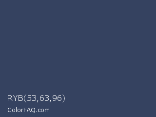 RYB 53,63,96 Color is a dark blue color and the nearest color is Rhino #2e3f62. Hex code #354260 and RGB value is rgb(53,66,96). In RGB color space, this color is composed of 21% red, 26% green, 38% blue, In CMYK color space, this color is composed of 45% cyan, 31% magenta, 0% yellow , 62% black , In HSL color space, this color has a hue angle of 222° , 29% saturation and 29% lightness.