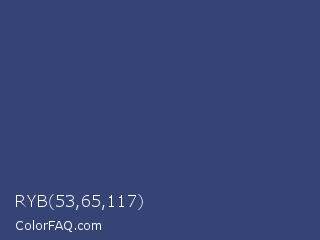RYB 53,65,117 Color is a normal blue color and the nearest color is San Juan #304b6a. Hex code #354475 and RGB value is rgb(53,68,117). In RGB color space, this color is composed of 21% red, 27% green, 46% blue, In CMYK color space, this color is composed of 55% cyan, 42% magenta, 0% yellow , 54% black , In HSL color space, this color has a hue angle of 226° , 38% saturation and 33% lightness.