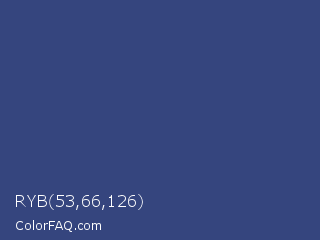 RYB 53,66,126 Color is a normal blue color and the nearest color is East Bay #414c7d. Hex code #35457e and RGB value is rgb(53,69,126). In RGB color space, this color is composed of 21% red, 27% green, 49% blue, In CMYK color space, this color is composed of 58% cyan, 45% magenta, 0% yellow , 51% black , In HSL color space, this color has a hue angle of 227° , 41% saturation and 35% lightness.
