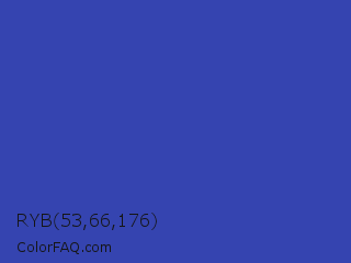 RYB 53,66,176 Color is a normal blue color and the nearest color is Violet Blue #324ab2. Hex code #3544b0 and RGB value is rgb(53,68,176). In RGB color space, this color is composed of 21% red, 27% green, 69% blue, In CMYK color space, this color is composed of 70% cyan, 61% magenta, 0% yellow , 31% black , In HSL color space, this color has a hue angle of 233° , 54% saturation and 45% lightness.