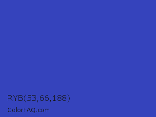 RYB 53,66,188 Color is a normal blue color and the nearest color is Violet Blue #324ab2. Hex code #3543bc and RGB value is rgb(53,67,188). In RGB color space, this color is composed of 21% red, 26% green, 74% blue, In CMYK color space, this color is composed of 72% cyan, 64% magenta, 0% yellow , 26% black , In HSL color space, this color has a hue angle of 234° , 56% saturation and 47% lightness.