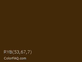 RYB 53,67,7 Color is a very dark orange color and the nearest color is Bracken #4a2a04. Hex code #432907 and RGB value is rgb(67,41,7). In RGB color space, this color is composed of 26% red, 16% green, 3% blue, In CMYK color space, this color is composed of 0% cyan, 39% magenta, 90% yellow , 74% black , In HSL color space, this color has a hue angle of 34° , 81% saturation and 15% lightness.