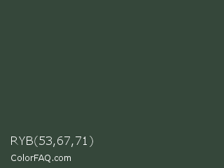 RYB 53,67,71 Color is a dark green color and the nearest color is Lunar Green #3c493a. Hex code #35473a and RGB value is rgb(53,71,58). In RGB color space, this color is composed of 21% red, 28% green, 23% blue, In CMYK color space, this color is composed of 25% cyan, 0% magenta, 18% yellow , 72% black , In HSL color space, this color has a hue angle of 137° , 15% saturation and 24% lightness.