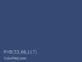 RYB 53,68,117 Color is a normal blue color and the nearest color is San Juan #304b6a. Hex code #354975 and RGB value is rgb(53,73,117). In RGB color space, this color is composed of 21% red, 29% green, 46% blue, In CMYK color space, this color is composed of 55% cyan, 38% magenta, 0% yellow , 54% black , In HSL color space, this color has a hue angle of 221° , 38% saturation and 33% lightness.