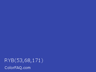 RYB 53,68,171 Color is a normal blue color and the nearest color is Violet Blue #324ab2. Hex code #3546ab and RGB value is rgb(53,70,171). In RGB color space, this color is composed of 21% red, 27% green, 67% blue, In CMYK color space, this color is composed of 69% cyan, 59% magenta, 0% yellow , 33% black , In HSL color space, this color has a hue angle of 231° , 53% saturation and 44% lightness.
