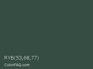 RYB 53,68,77 Color is a dark green color and the nearest color is Cape Cod #3c4443. Hex code #354d43 and RGB value is rgb(53,77,67). In RGB color space, this color is composed of 21% red, 30% green, 26% blue, In CMYK color space, this color is composed of 31% cyan, 0% magenta, 13% yellow , 70% black , In HSL color space, this color has a hue angle of 155° , 18% saturation and 25% lightness.