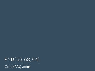 RYB 53,68,94 Color is a dark blue color and the nearest color is Pickled Bluewood #314459. Hex code #354d5e and RGB value is rgb(53,77,94). In RGB color space, this color is composed of 21% red, 30% green, 37% blue, In CMYK color space, this color is composed of 44% cyan, 18% magenta, 0% yellow , 63% black , In HSL color space, this color has a hue angle of 205° , 28% saturation and 29% lightness.