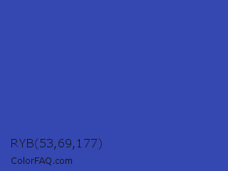 RYB 53,69,177 Color is a normal blue color and the nearest color is Violet Blue #324ab2. Hex code #3547b1 and RGB value is rgb(53,71,177). In RGB color space, this color is composed of 21% red, 28% green, 69% blue, In CMYK color space, this color is composed of 70% cyan, 60% magenta, 0% yellow , 31% black , In HSL color space, this color has a hue angle of 231° , 54% saturation and 45% lightness.