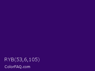 RYB 53,6,105 Color is a very dark violet color and the nearest color is Christalle #33036b. Hex code #350669 and RGB value is rgb(53,6,105). In RGB color space, this color is composed of 21% red, 2% green, 41% blue, In CMYK color space, this color is composed of 50% cyan, 94% magenta, 0% yellow , 59% black , In HSL color space, this color has a hue angle of 268° , 89% saturation and 22% lightness.