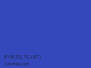 RYB 53,70,187 Color is a normal blue color and the nearest color is Violet Blue #324ab2. Hex code #3548bb and RGB value is rgb(53,72,187). In RGB color space, this color is composed of 21% red, 28% green, 73% blue, In CMYK color space, this color is composed of 72% cyan, 61% magenta, 0% yellow , 27% black , In HSL color space, this color has a hue angle of 231° , 56% saturation and 47% lightness.