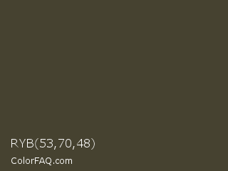 RYB 53,70,48 Color is a dark yellow color and the nearest color is Taupe #483c32. Hex code #464230 and RGB value is rgb(70,66,48). In RGB color space, this color is composed of 27% red, 26% green, 19% blue, In CMYK color space, this color is composed of 0% cyan, 6% magenta, 31% yellow , 73% black , In HSL color space, this color has a hue angle of 49° , 19% saturation and 23% lightness.