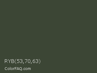RYB 53,70,63 Color is a dark green color and the nearest color is Lunar Green #3c493a. Hex code #3c4635 and RGB value is rgb(60,70,53). In RGB color space, this color is composed of 24% red, 27% green, 21% blue, In CMYK color space, this color is composed of 14% cyan, 0% magenta, 24% yellow , 73% black , In HSL color space, this color has a hue angle of 95° , 14% saturation and 24% lightness.