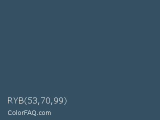 RYB 53,70,99 Color is a dark blue color and the nearest color is San Juan #304b6a. Hex code #355063 and RGB value is rgb(53,80,99). In RGB color space, this color is composed of 21% red, 31% green, 39% blue, In CMYK color space, this color is composed of 46% cyan, 19% magenta, 0% yellow , 61% black , In HSL color space, this color has a hue angle of 205° , 30% saturation and 30% lightness.