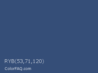RYB 53,71,120 Color is a normal blue color and the nearest color is East Bay #414c7d. Hex code #354e78 and RGB value is rgb(53,78,120). In RGB color space, this color is composed of 21% red, 31% green, 47% blue, In CMYK color space, this color is composed of 56% cyan, 35% magenta, 0% yellow , 53% black , In HSL color space, this color has a hue angle of 218° , 39% saturation and 34% lightness.