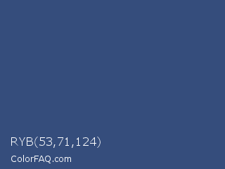 RYB 53,71,124 Color is a normal blue color and the nearest color is East Bay #414c7d. Hex code #354d7c and RGB value is rgb(53,77,124). In RGB color space, this color is composed of 21% red, 30% green, 49% blue, In CMYK color space, this color is composed of 57% cyan, 38% magenta, 0% yellow , 51% black , In HSL color space, this color has a hue angle of 220° , 40% saturation and 35% lightness.
