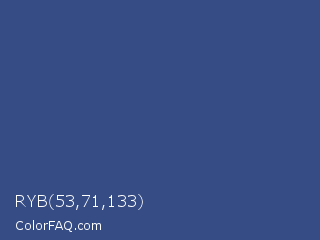 RYB 53,71,133 Color is a normal blue color and the nearest color is Chambray #354e8c. Hex code #354c85 and RGB value is rgb(53,76,133). In RGB color space, this color is composed of 21% red, 30% green, 52% blue, In CMYK color space, this color is composed of 60% cyan, 43% magenta, 0% yellow , 48% black , In HSL color space, this color has a hue angle of 223° , 43% saturation and 36% lightness.