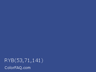 RYB 53,71,141 Color is a normal blue color and the nearest color is Chambray #354e8c. Hex code #354c8d and RGB value is rgb(53,76,141). In RGB color space, this color is composed of 21% red, 30% green, 55% blue, In CMYK color space, this color is composed of 62% cyan, 46% magenta, 0% yellow , 45% black , In HSL color space, this color has a hue angle of 224° , 45% saturation and 38% lightness.