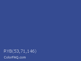 RYB 53,71,146 Color is a normal blue color and the nearest color is Chambray #354e8c. Hex code #354b92 and RGB value is rgb(53,75,146). In RGB color space, this color is composed of 21% red, 29% green, 57% blue, In CMYK color space, this color is composed of 64% cyan, 49% magenta, 0% yellow , 43% black , In HSL color space, this color has a hue angle of 226° , 47% saturation and 39% lightness.