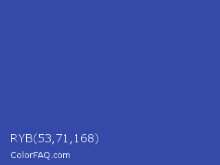 RYB 53,71,168 Color is a normal blue color and the nearest color is Violet Blue #324ab2. Hex code #354aa8 and RGB value is rgb(53,74,168). In RGB color space, this color is composed of 21% red, 29% green, 66% blue, In CMYK color space, this color is composed of 68% cyan, 56% magenta, 0% yellow , 34% black , In HSL color space, this color has a hue angle of 229° , 52% saturation and 43% lightness.
