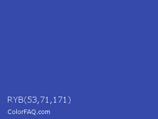 RYB 53,71,171 Color is a normal blue color and the nearest color is Violet Blue #324ab2. Hex code #354aab and RGB value is rgb(53,74,171). In RGB color space, this color is composed of 21% red, 29% green, 67% blue, In CMYK color space, this color is composed of 69% cyan, 57% magenta, 0% yellow , 33% black , In HSL color space, this color has a hue angle of 229° , 53% saturation and 44% lightness.
