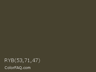 RYB 53,71,47 Color is a dark yellow color and the nearest color is Taupe #483c32. Hex code #47422f and RGB value is rgb(71,66,47). In RGB color space, this color is composed of 28% red, 26% green, 18% blue, In CMYK color space, this color is composed of 0% cyan, 7% magenta, 34% yellow , 72% black , In HSL color space, this color has a hue angle of 48° , 20% saturation and 23% lightness.