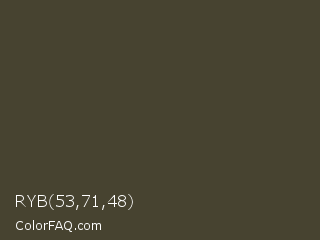 RYB 53,71,48 Color is a dark yellow color and the nearest color is Taupe #483c32. Hex code #474330 and RGB value is rgb(71,67,48). In RGB color space, this color is composed of 28% red, 26% green, 19% blue, In CMYK color space, this color is composed of 0% cyan, 6% magenta, 32% yellow , 72% black , In HSL color space, this color has a hue angle of 50° , 19% saturation and 23% lightness.