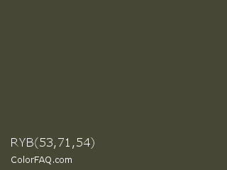 RYB 53,71,54 Color is a dark yellow color and the nearest color is Kelp #454936. Hex code #464735 and RGB value is rgb(70,71,53). In RGB color space, this color is composed of 27% red, 28% green, 21% blue, In CMYK color space, this color is composed of 1% cyan, 0% magenta, 25% yellow , 72% black , In HSL color space, this color has a hue angle of 63° , 15% saturation and 24% lightness.